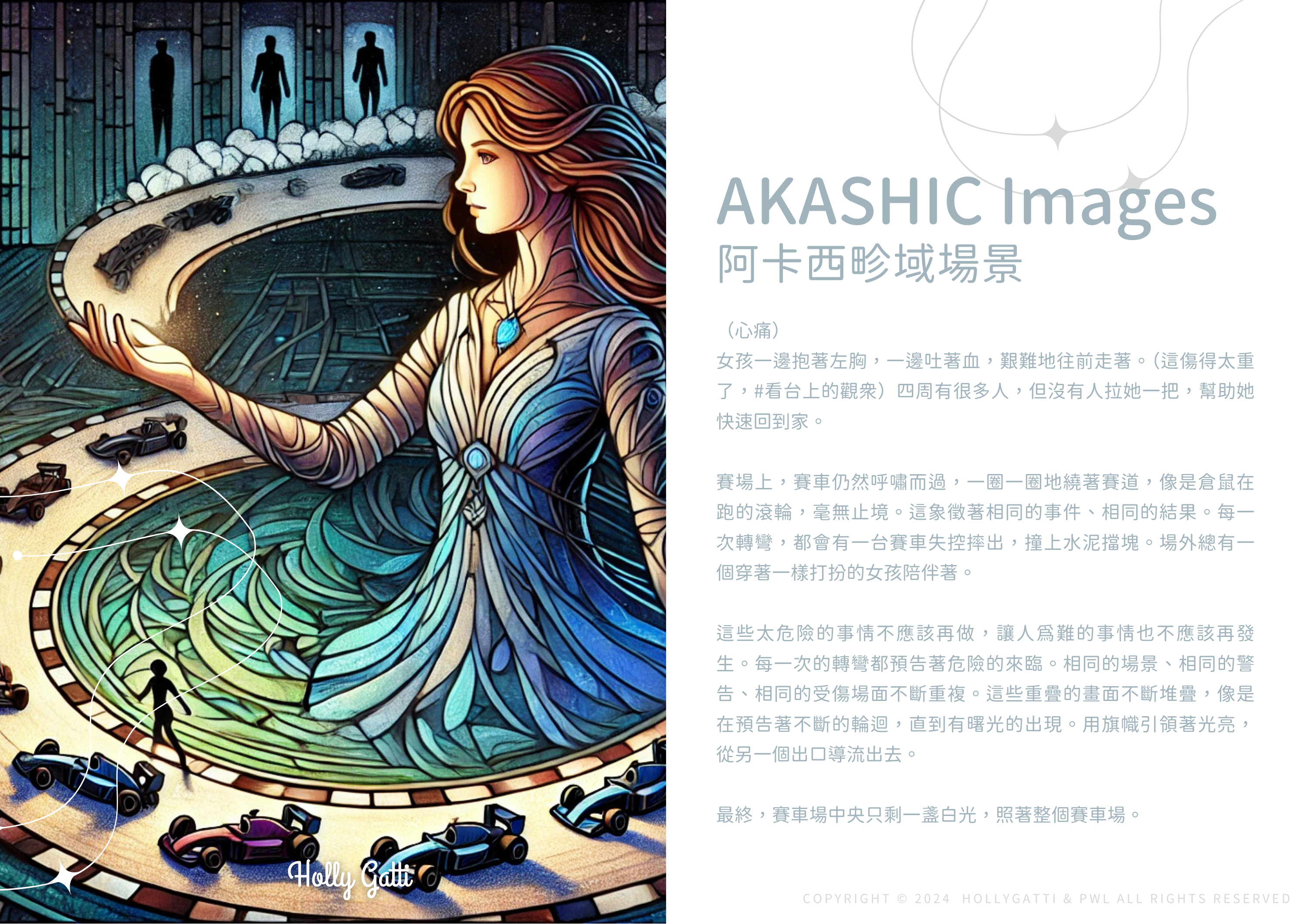 重複模式的根源常源於無法解決的內在課題或情感需求。在此個案阿卡西畛域閱讀場景中,每一次轉彎就有賽車失控摔出,相同的事件、相同的結果無止境的重複出現。我們的重複模式往往因無意識的行為習慣而不斷加深,可能是因為某些過去的經歷讓我們無法釋懷,或是源於深層的情感創傷,或是某些執著的信念。我們重複這些模式,因為它們使我們陷入熟悉的情緒,即便結果總是痛苦。